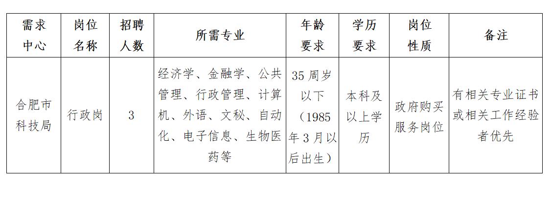 因工作需要,合肥市科學(xué)技術(shù)局現(xiàn)擬面向社會(huì)公開(kāi)招聘政府購(gòu)買服務(wù)崗位工作人員3名?,F(xiàn)就有關(guān)事項(xiàng)公告如下: