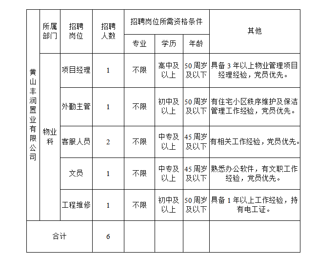 黃山豐潤置業(yè)有限公司為黃山市徽州國有投資集團(tuán)有限公司下屬子公司,公司主從事房地產(chǎn)開發(fā)經(jīng)營、銷售,城市基礎(chǔ)設(shè)施投資建設(shè),物業(yè)管理;旅游項(xiàng)目開發(fā)經(jīng)營。公司現(xiàn)因工作需要,面向社會公開招聘5名購買服務(wù)崗位人員。