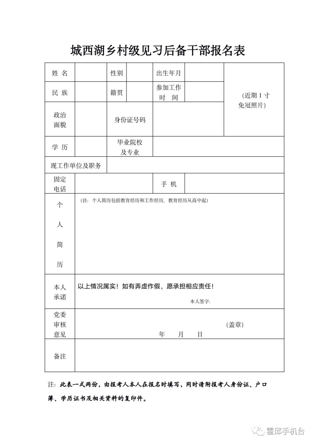 報名方式:符合條件的報名人員需攜帶有效居民身份證、戶口薄、學(xué)歷畢業(yè)證書、黨員證明材料、退役軍人證明原件以及復(fù)印件各1份、1寸證件照4張到鄉(xiāng)黨建辦報名,填寫《城西湖鄉(xiāng)公開選聘見習(xí)村干部報名表》報名。