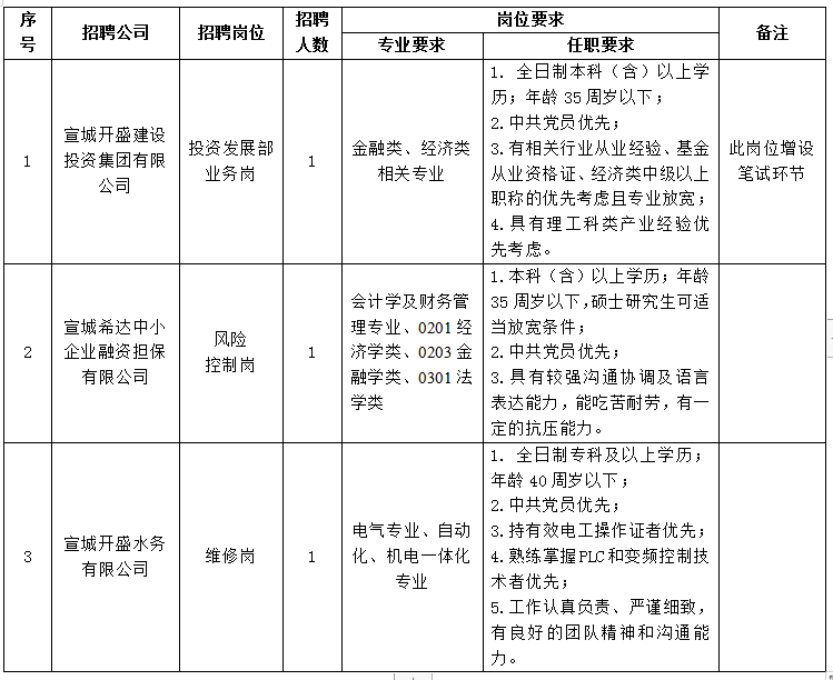宣城開盛建設(shè)投資集團(tuán)有限公司(簡稱“開盛集團(tuán)”)是宣城經(jīng)濟(jì)技術(shù)開發(fā)區(qū)國有獨(dú)資公司,現(xiàn)因業(yè)務(wù)發(fā)展需要面向社會(huì)公開招聘3名工作人員。具體招聘要求如下: