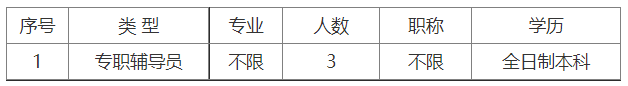 專職輔導員:全日制本科及以上學歷,要求中共黨員。有心理學、教育學、思政類相關專業(yè)優(yōu)先;有心理咨詢師、就業(yè)指導師證書的優(yōu)先。