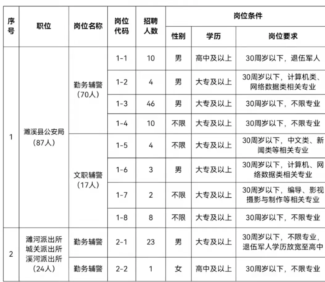 淮北市公安局根據(jù)工作需要,面向社會公開招聘161名警務(wù)輔助人員?,F(xiàn)就有關(guān)事項公告如下: