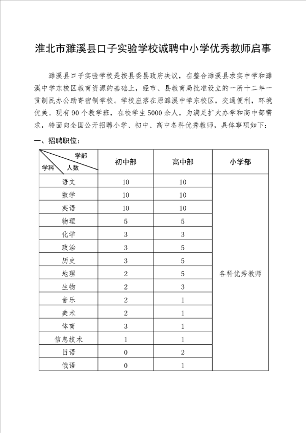 淮北市濉溪縣口子實(shí)驗(yàn)學(xué)校誠(chéng)聘中小學(xué)優(yōu)秀教師啟事