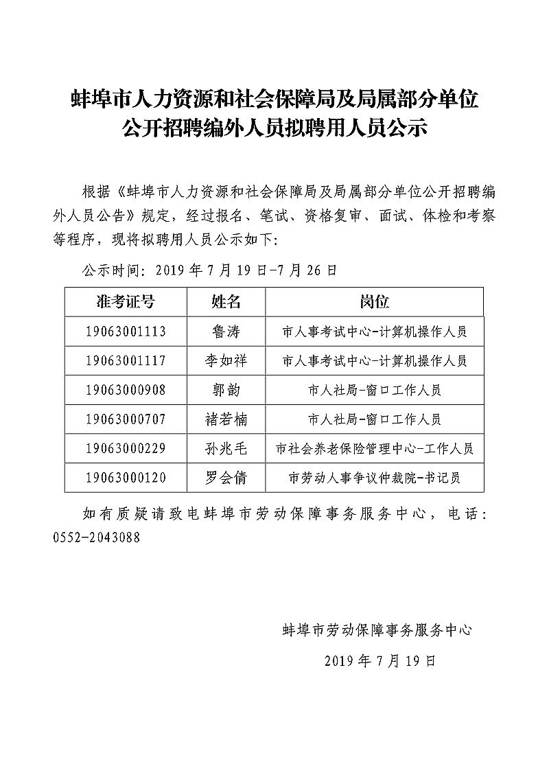 2019蚌埠市人社局及局屬部分單位招聘擬聘用人員公示